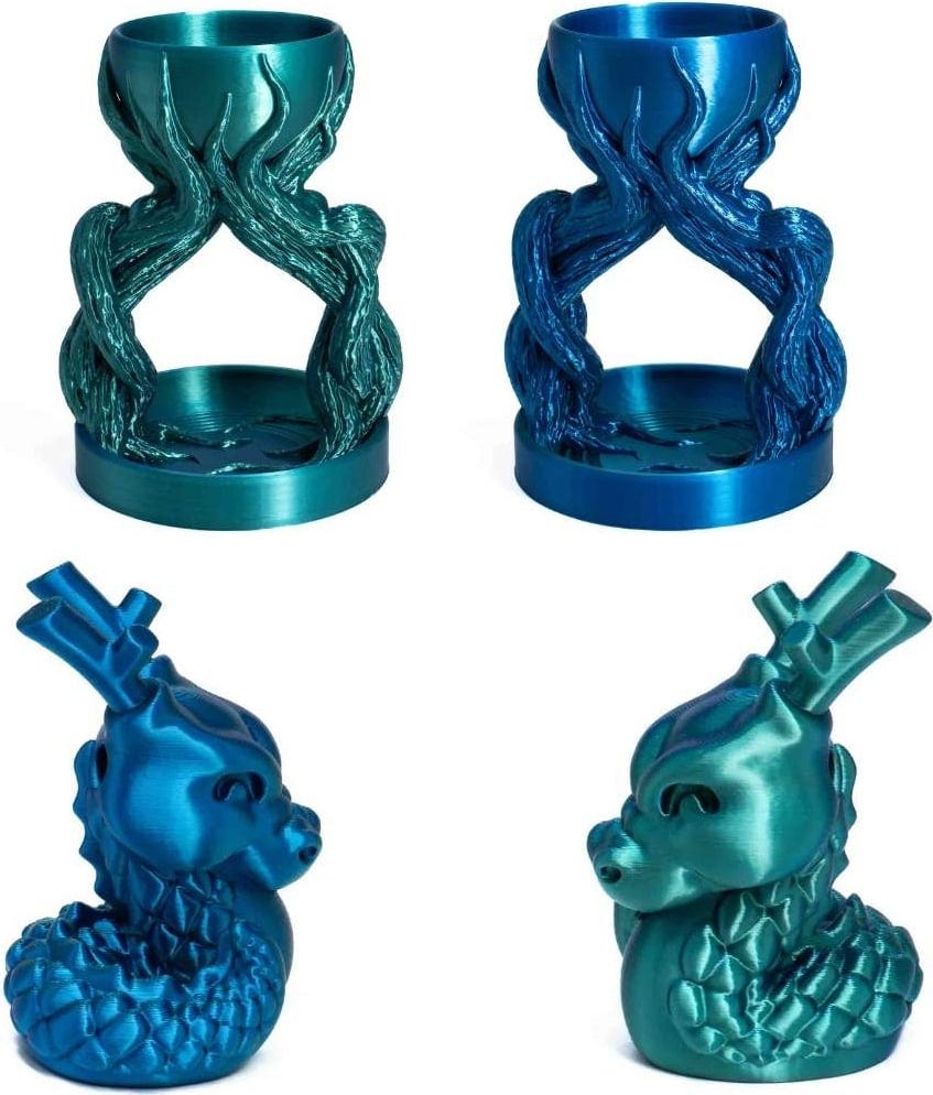 Utilizzando una tecnologia di coestrusione all'avanguardia, il PLA Silk Multicolor combina due o anche tre colori in un unico filamento. Questo crea sfumature di colore fluide ed effetti di brillantezza unici che cambiano a seconda dell'angolazione. Questo rende ogni stampa unica, che si tratti di un vaso, una statuetta, un gioiello o un accessorio decorativo per la casa.