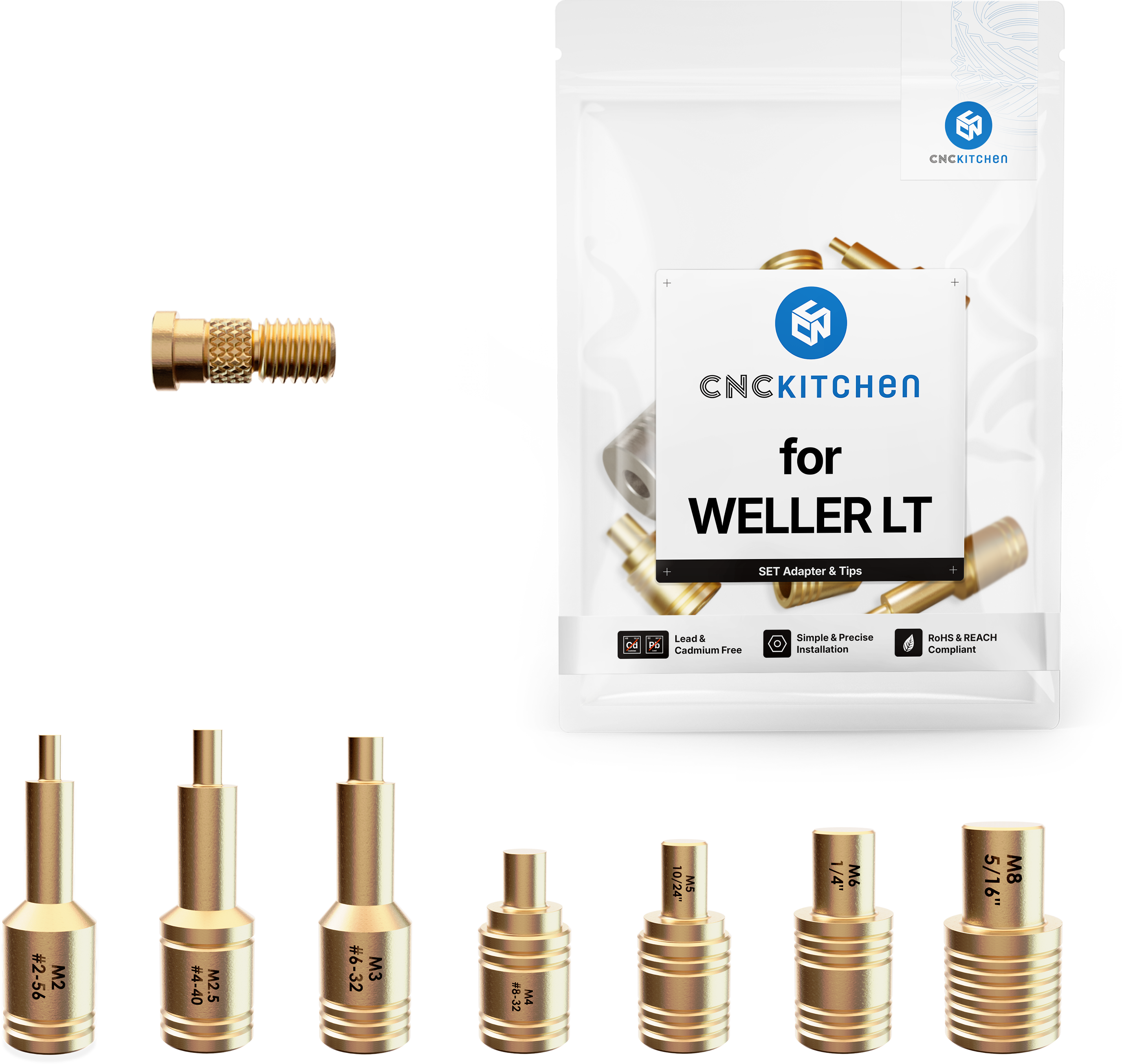 Le punte di saldatura sono compatibili con i saldatori Weller LT (ad esempio WSP 80) e si adattano perfettamente agli inserti filettati CNC Kitchen. Le punte di saldatura sono dotate di marcature laser e tacche per una facile identificazione delle dimensioni e sono conformi alle normative REACH.