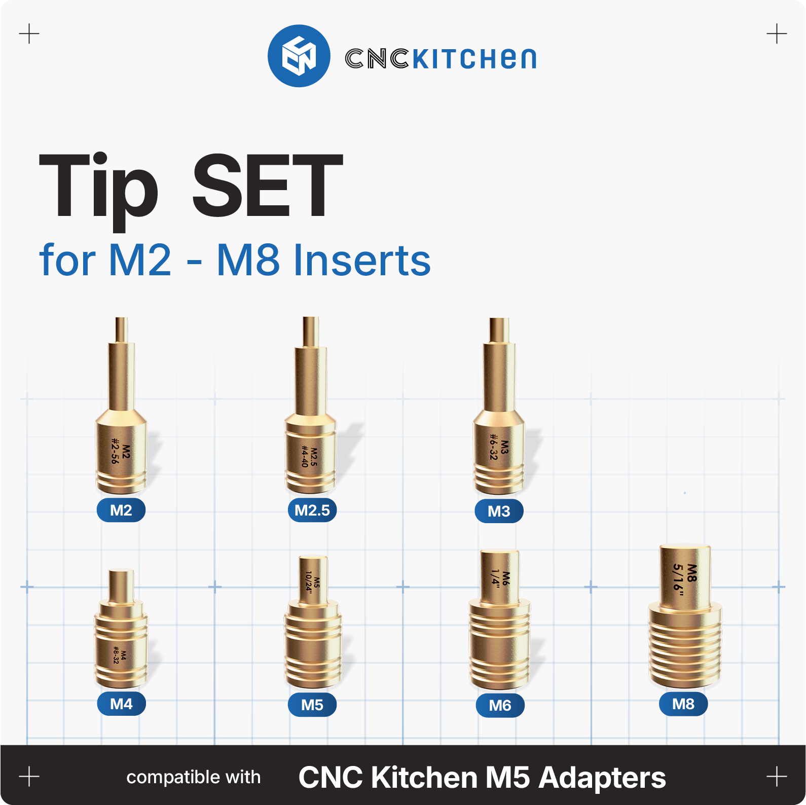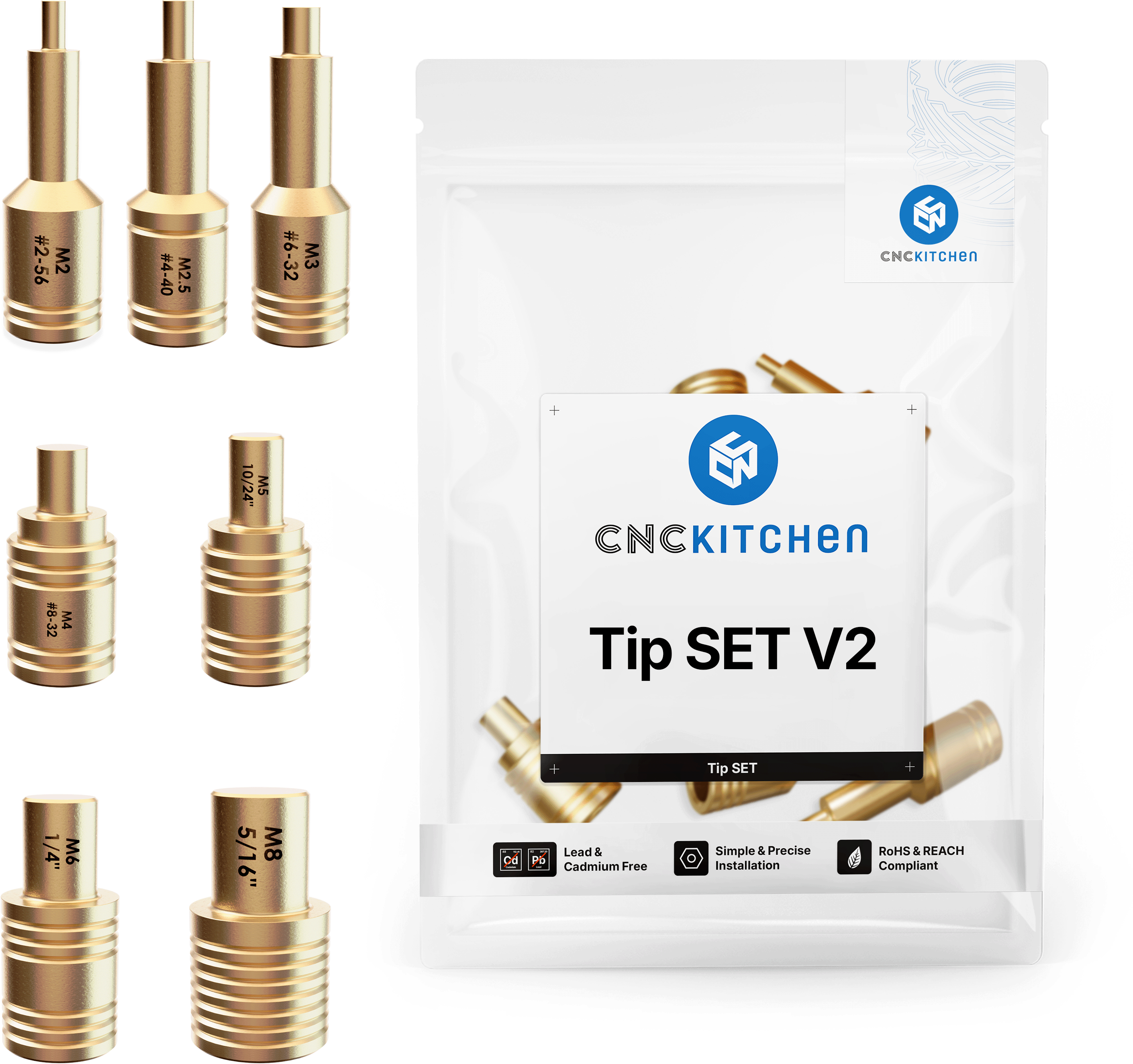 Le punte avvitabili sono compatibili con i saldatori TS100 e TS101 nonché con gli adattatori CNC Kitchen Weller, 900M e T18 V2 e si adattano perfettamente agli inserti filettati CNC Kitchen. Sono dotate di marcature laser e tacche per una facile identificazione delle dimensioni e sono conformi alle normative REACH.