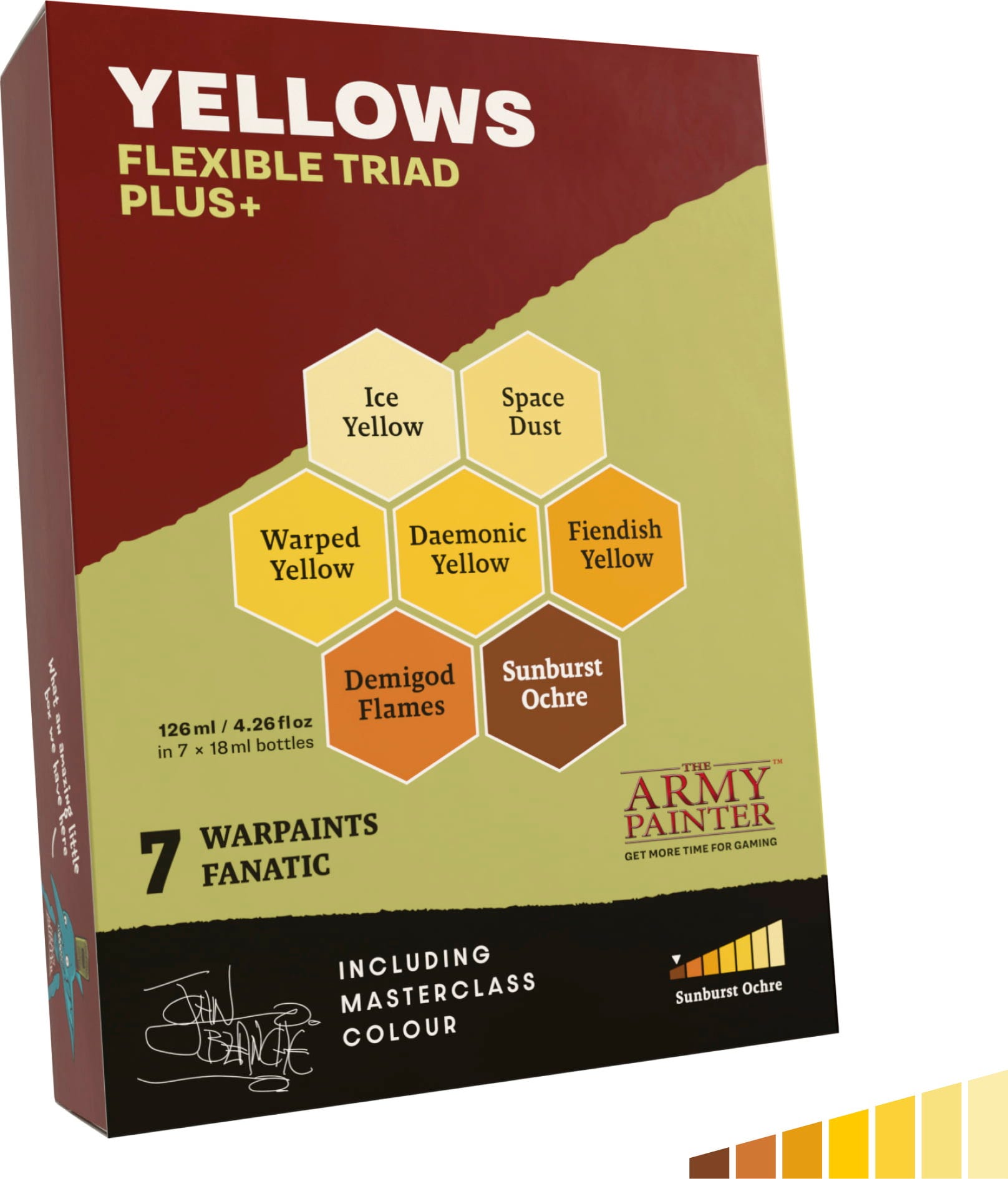 Come extra è incluso un settimo colore: Sunburst Ochre. Sviluppato in collaborazione con l'artista di culto John Blanche per la Masterclass Series, questo tono rappresenta un perfetto punto di raccordo tra calore, profondità ed espressività artistica, ideale per aggiungere carattere e coerenza cromatica ai tuoi progetti.