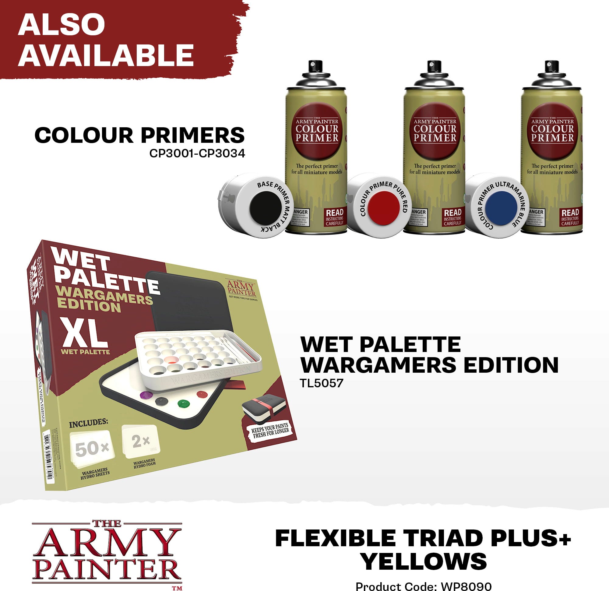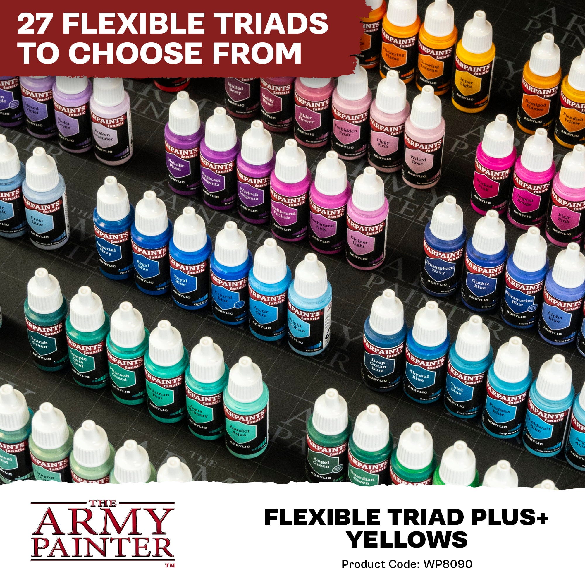 Con il Flexible Colour Triad System, The Army Painter ha sviluppato un concetto intelligente che semplifica la miscelazione e la selezione dei colori durante la pittura delle miniature. Ogni triade è composta da sei colori, tutti basati su un colore di base comune. Questi colori vanno dal molto scuro al molto chiaro, creando una palette di colori armoniosa.